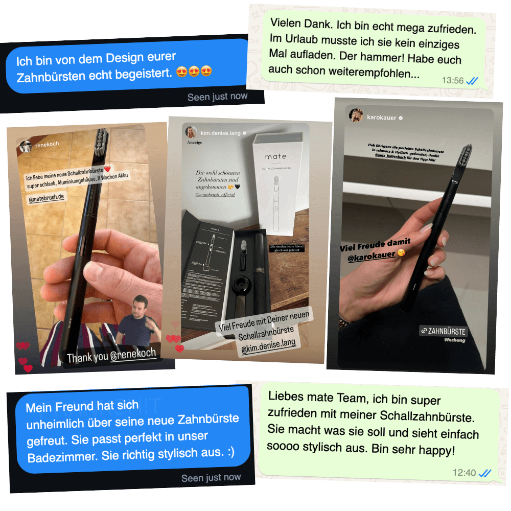 Mit mehr als 40.000 zufriedenen Kunden hat sich mate in kurzer Zeit zu einer der beliebtesten Designer-Schallzahnbürsten in Deutschland entwickelt. VIELEN DANK für so viel Vertrauen!